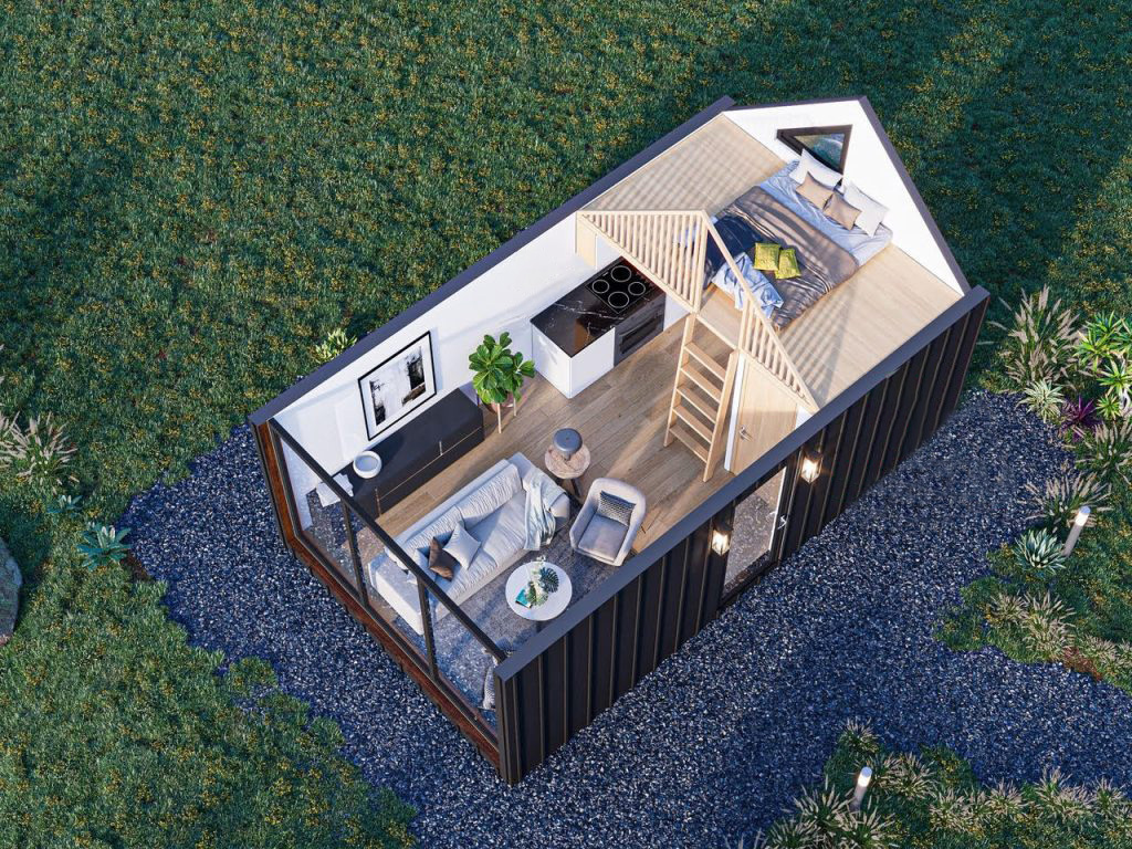 Opið rými stofa og eldhús, baðherbergi og svefnherbergi á millihæð