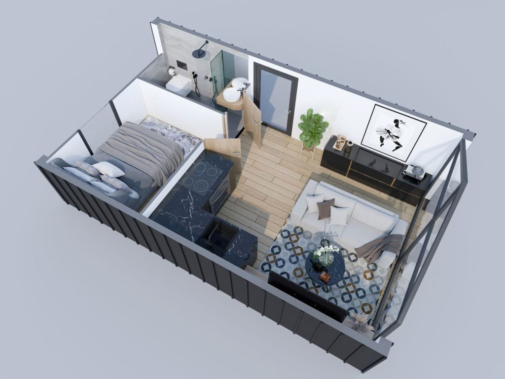 Opið rými stofa og eldhúsa, svefnherbergi og baðherbergi